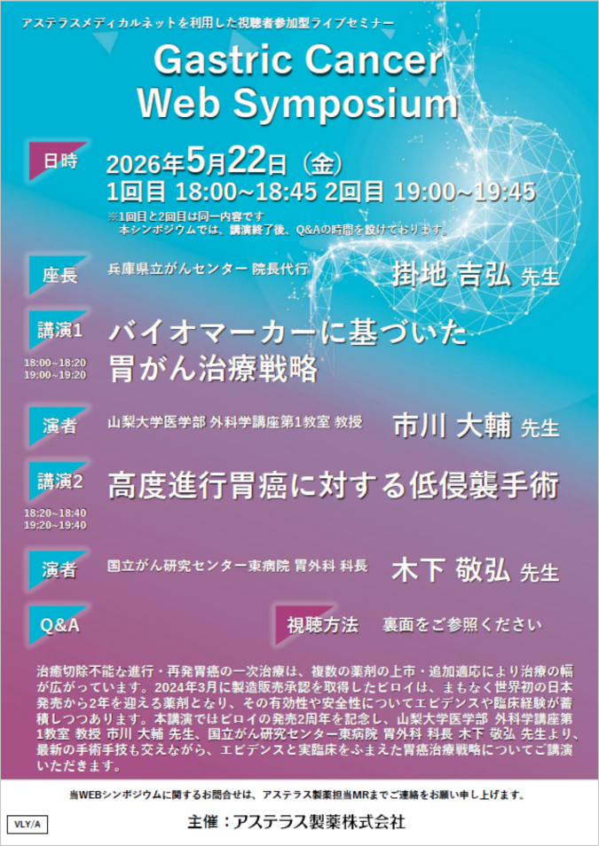 <座長> 兵庫県立がんセンター 院長代行 掛地 吉弘 先生 <演者> 山梨大学医学部 外科学講座第1教室 教授 市川 大輔 先生 国立がん研究センター東病院 胃外科 科長 木下 敬弘 先生